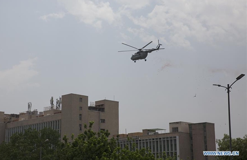 An Indian Air Force helicopter showers flower petals at the All India Institute of Medical Sciences (AIIMS) to pay tribute to doctors, nurses and police personnel who battle against COVID-19 pandemic in New Delhi, India, May 3, 2020. (Photo by Javed Dar/Xinhua)