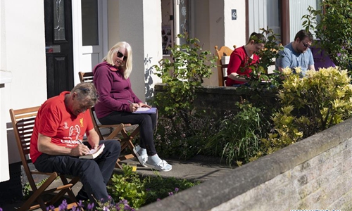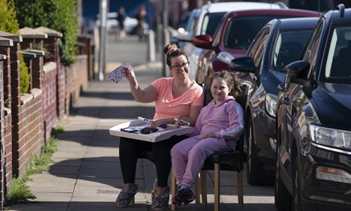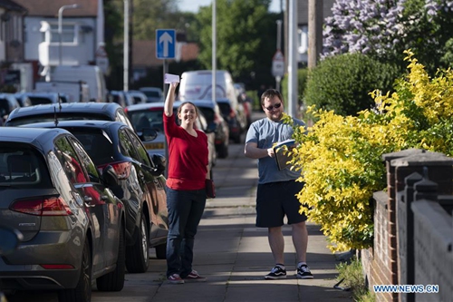 Residents of Dovercliff Road take part in a game of Bingo organised by David Walsh as members of the public find ways to entertain themselves while sticking to government guidelines and observing social distancing in Liverpool, Britain on May 2, 2020. (Photo by Jon Super/Xinhua)