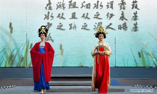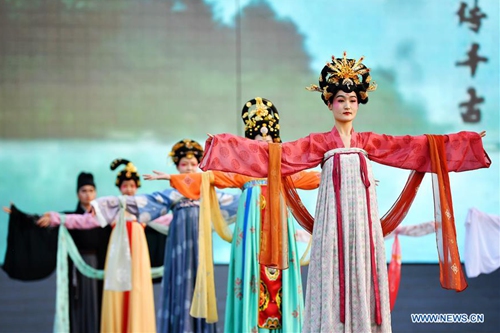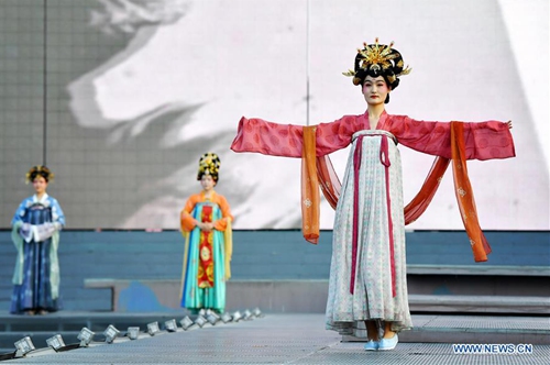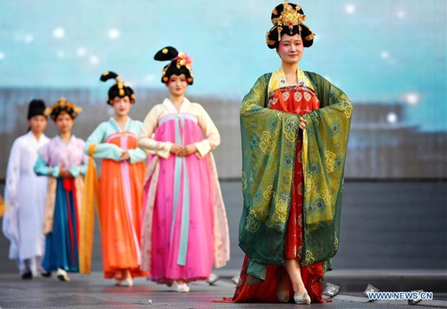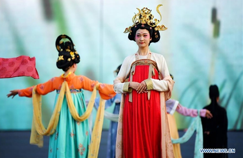 Performers dressed in costumes of Tang Dynasty (618-907 AD) present a show at Great Tang All Day Mall in Xi'an, capital of northwest China's Shaanxi Province, May 2, 2020. (Xinhua/Liu Xiao)