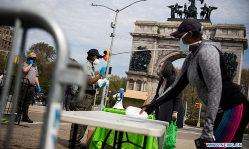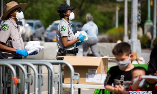 New York City urban park rangers hand out free face masks at the Prospect Park in the Brooklyn borough of New York, the United States, May 3, 2020. New York City (NYC) will be distributing over 100,000 face coverings in parks across the city free of charge from May 2 to 5. According to the guidance from the NYC Health Department, all New Yorkers are required to wear a mask or face covering in public and in situations where a 6-foot distance from others cannot be maintained. (Photo: Xinhua)