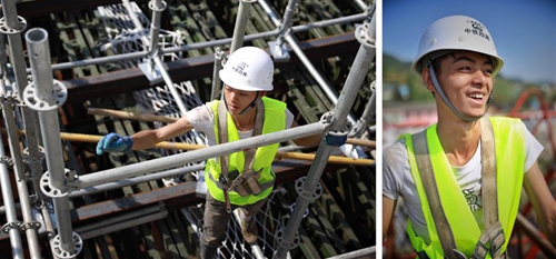 Combo photo taken on May 3, 2020 shows scaffolder Liu Yuankui installing scaffolds (left) and posing for a photo at the construction site of the Renhuai-Zunyi expressway in Zunyi, southwest China's Guizhou Province. Liu, 23, from Weining County of Guizhou, has been working as a scaffolder for more than 2 years. Many young workers have stuck to their positions during Labor Day holiday. (Photo: Xinhua)