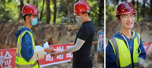 Combo photo taken on May 3, 2020 shows Cao Xiongbin checking the temperature of his colleague (left) and posing for a photo at the construction site of the Renhuai-Zunyi expressway in Zunyi, southwest China's Guizhou Province. Cao, 25, from Jingdezhen of Jiangxi Province, has been working as a staff member on the COVID-19 control and prevention since early time this year. Many young workers have stuck to their positions during Labor Day holiday. (Photo: Xinhua)