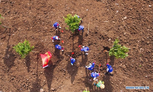 In this aerial photo taken on May 4, 2020, people take part in a tree planting activity marking the Chinese Youth Day in Haikou, south China's Hainan Province. (Xinhua/Yang Guanyu)