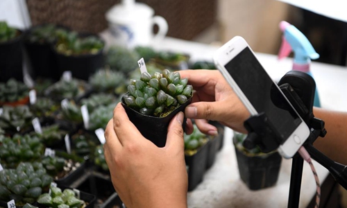 Ni Xinxin broadcasts live to show succulents at a greenhouse in Huagang Town, Feixi County, east China's Anhui Province, May 3, 2020. Ni, 32, started the business of succulent planting after graduating from college. In 2016, Ni Xinxin rented nearly 100 mu (about 6.7 hectares) of land in Huagang Town to plant succulents. In the past two years, Ni has seized the upsurge of online live broadcast to sell succulents. The live broadcast sales have exceeded half of the total sales. Up to now, Ni Xinxin's annual sales volume of succulents has exceeded 10 million yuan (1.42 million U.S. dollars). (Xinhua/Liu Junxi)