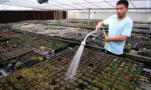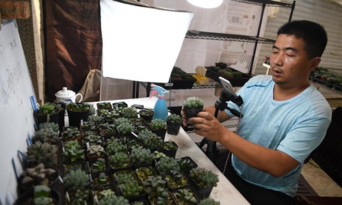 Ni Xinxin waters succulents at a greenhouse in Huagang Town, Feixi County, east China's Anhui Province, May 3, 2020. Ni, 32, started the business of succulent planting after graduating from college. In 2016, Ni Xinxin rented nearly 100 mu (about 6.7 hectares) of land in Huagang Town to plant succulents. In the past two years, Ni has seized the upsurge of online live broadcast to sell succulents. The live broadcast sales have exceeded half of the total sales. Up to now, Ni Xinxin's annual sales volume of succulents has exceeded 10 million yuan (1.42 million U.S. dollars). (Xinhua/Liu Junxi)