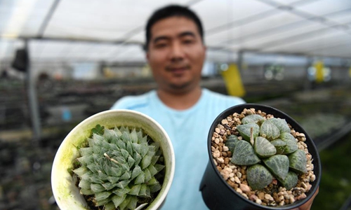 Ni Xinxin shows succulents at a greenhouse in Huagang Town, Feixi County, east China's Anhui Province, May 3, 2020. Ni, 32, started the business of succulent planting after graduating from college. In 2016, Ni Xinxin rented nearly 100 mu (about 6.7 hectares) of land in Huagang Town to plant succulents. In the past two years, Ni has seized the upsurge of online live broadcast to sell succulents. The live broadcast sales have exceeded half of the total sales. Up to now, Ni Xinxin's annual sales volume of succulents has exceeded 10 million yuan (1.42 million U.S. dollars). (Xinhua/Liu Junxi)