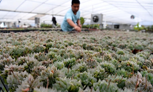 Ni Xinxin weeds for succulents at a greenhouse in Huagang Town, Feixi County, east China's Anhui Province, May 3, 2020. Ni, 32, started the business of succulent planting after graduating from college. In 2016, Ni Xinxin rented nearly 100 mu (about 6.7 hectares) of land in Huagang Town to plant succulents. In the past two years, Ni has seized the upsurge of online live broadcast to sell succulents. The live broadcast sales have exceeded half of the total sales. Up to now, Ni Xinxin's annual sales volume of succulents has exceeded 10 million yuan (1.42 million U.S. dollars). (Xinhua/Liu Junxi)