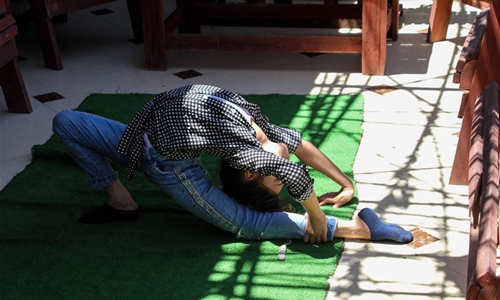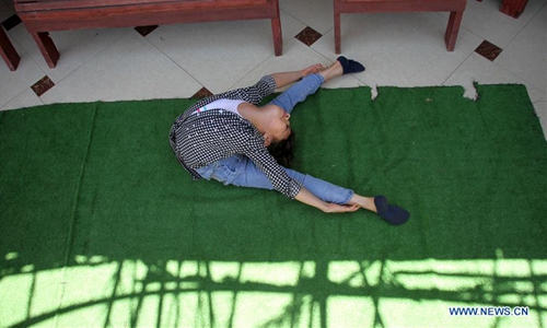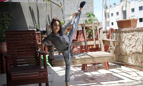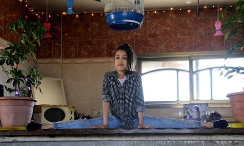 Palestinian girl Marah Abdel Aziz shows her fitness and acrobatics skills at home after gyms were closed due to the lockdown measures during the COVID-19 pandemic, in Gaza City, on May 4, 2020. (Photo by Rizek Abdeljawad/Xinhua)