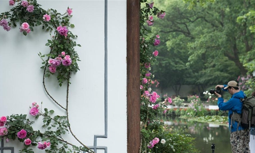 A visitor takes photos of the rosa chinensis at the Guozhuang scenic area by the West Lake in Hangzhou, east China's Zhejiang Province, May 5, 2020. A rosa chinensis flower show was open to public during the Labor Day holiday in Hangzhou, displaying more than 700 species of rosa chinensis flowers from home and abroad. (Xinhua/Weng Xinyang)