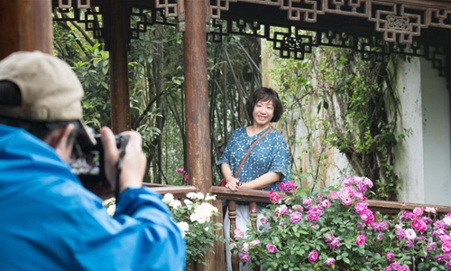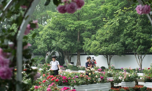 Visitors view the rosa chinensis at the Guozhuang scenic area by the West Lake in Hangzhou, east China's Zhejiang Province, May 5, 2020. A rosa chinensis flower show was open to public during the Labor Day holiday in Hangzhou, displaying more than 700 species of rosa chinensis flowers from home and abroad. (Xinhua/Weng Xinyang)