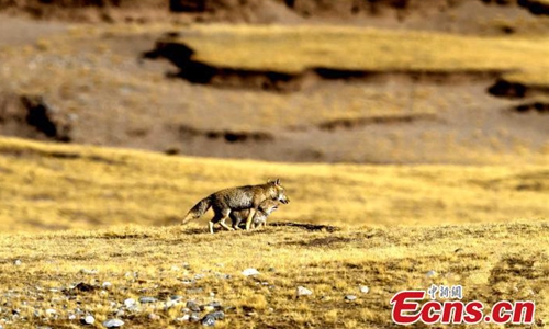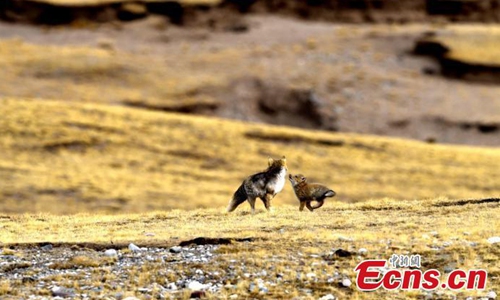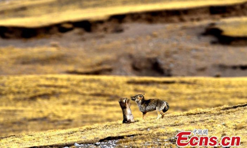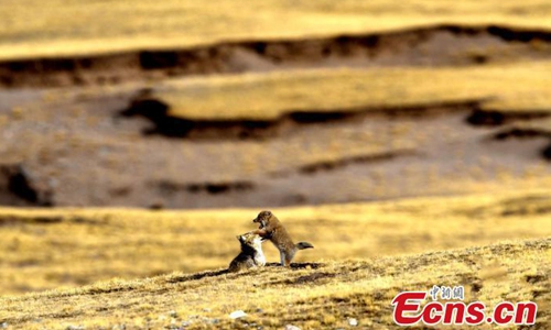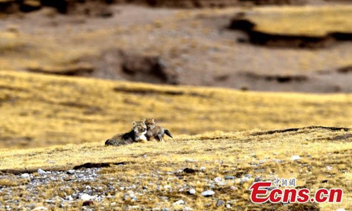 A Tibetan fox and her cub are seen playing in Tianjun county, northwest China's Qinghai Province. Tibetan fox, a species restricted to the Tibetan Plateau, is known for its smiling face.Photo:China News Service