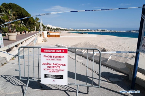 Photo taken on April 18, 2020 shows a taped-off beach in Cannes, France. A further 642 people had died of COVID-19 in the past 24 hours in France, raising the country's death toll to 19,323, official data showed on Saturday. (Photo by Serge Haouzi/Xinhua)