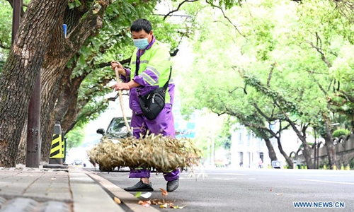 A sanitation worker cleans up a street in Fuzhou, southeast China's Fujian Province, May 1, 2020. People from various sectors stick to their posts during the International Labor Day holiday. (Xinhua/Lin Shanchuan)