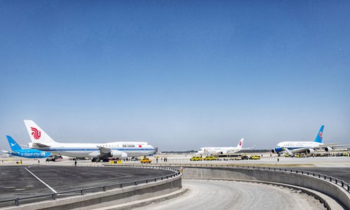 Four planes sit in Beijing Daxing International Airport on Monday morning during a rehearsal for future operations. The new airport is scheduled to be operational at the end of September. Photo: Cui Meng/GT