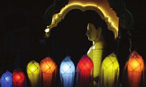 A Buddha statue in Sri Lanka is seen lit up with lanterns during Vesak day, the most important festival for Buddhists as the country remains under a 24-hour curfew imposed to prevent the spread of COVID-19 at the Mahamevnawa Temple in Colombo on Thursday. Photo: AFP