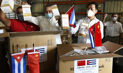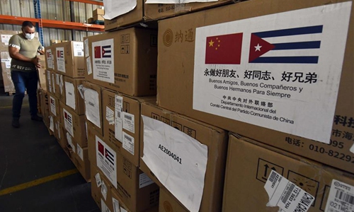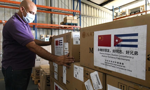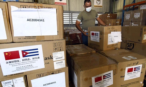 A staff member transports medical supplies donated by the International Department of the Communist Party of China Central Committee in Havana, Cuba, May 6, 2020. Cuba received on Wednesday a donation of medical supplies from the International Department of the Communist Party of China Central Committee amid the Caribbean nation's efforts to fight the COVID-19 pandemic. Photo:Xinhua