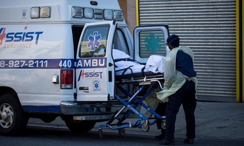 Medical workers carry a patient into an ambulance in New York, the US, April 6, 2020. Photo: Xinhua