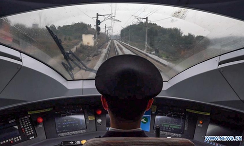 A bullet train driver is on duty on the way back to Guilinbei Railway Station in Guilin, south China's Guangxi Zhuang Autonomous Region, May 6, 2020. Bullet train drivers from Guangxi, sent by China Railway Nanning Group Co., Ltd. to aid the fight against the COVID-19 epidemic in Wuhan, returned home on Wednesday. Twenty-three drivers had undertaken the tasks of driving 16 pairs of bullet trains with a total of 1,120 trips to ensure the delivery of anti-epidemic materials. (Xinhua/Zhang Ailin)