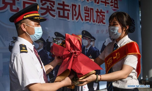 A volunteer (R) presents flowers to bullet train driver Xu Weifeng at Guilinbei Railway Station in Guilin, south China's Guangxi Zhuang Autonomous Region, May 6, 2020. Bullet train drivers from Guangxi, sent by China Railway Nanning Group Co., Ltd. to aid the fight against the COVID-19 epidemic in Wuhan, returned home on Wednesday. Twenty-three drivers had undertaken the tasks of driving 16 pairs of bullet trains with a total of 1,120 trips to ensure the delivery of anti-epidemic materials. (Xinhua/Zhang Ailin)