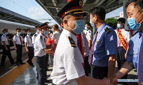 Bullet train drivers from China Railway Nanning Group Co., Ltd. arrive at Guilinbei Railway Station in Guilin, south China's Guangxi Zhuang Autonomous Region, May 6, 2020. Bullet train drivers from Guangxi, sent by China Railway Nanning Group Co., Ltd. to aid the fight against the COVID-19 epidemic in Wuhan, returned home on Wednesday. Twenty-three drivers had undertaken the tasks of driving 16 pairs of bullet trains with a total of 1,120 trips to ensure the delivery of anti-epidemic materials. (Xinhua/Zhang Ailin)