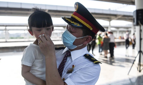 Bullet train driver Yuan Fa holds his daughter at Guilinbei Railway Station in Guilin, south China's Guangxi Zhuang Autonomous Region, May 6, 2020. Bullet train drivers from Guangxi, sent by China Railway Nanning Group Co., Ltd. to aid the fight against the COVID-19 epidemic in Wuhan, returned home on Wednesday. Twenty-three drivers had undertaken the tasks of driving 16 pairs of bullet trains with a total of 1,120 trips to ensure the delivery of anti-epidemic materials. (Xinhua/Zhang Ailin)