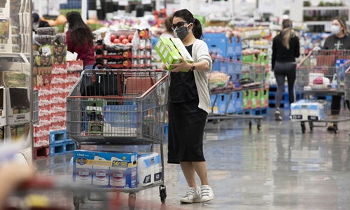 People wearing face masks are seen shopping at a supermarket in Foster City, the United States, April 22, 2020. (Photo by Li Jianguo/Xinhua)