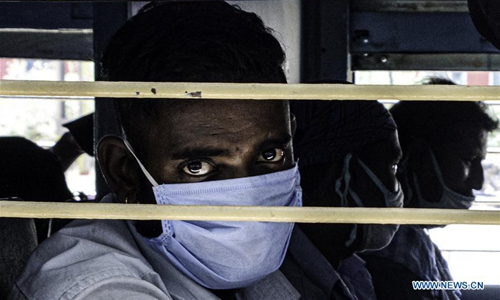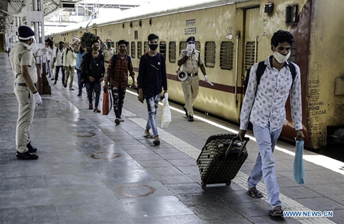 Migrant workers arrive to board a train for their journey back home during a nationwide lockdown to fight the spread of COVID-19 in Mumbai, India, May 8, 2020. (Str/Xinhua)