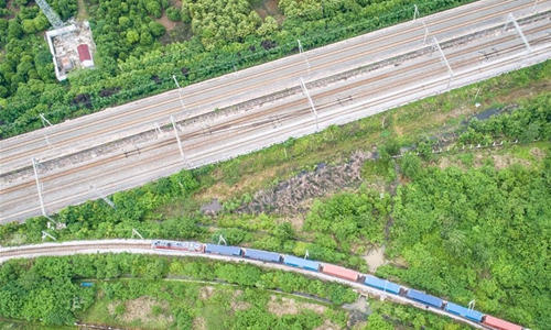 Aerial photo shows a China-Europe freight train departing from Wujiashan railway container center station in Wuhan, central China's Hubei Province, May 9, 2020. A China-Europe freight train carrying anti-epidemic supplies on Saturday left Wuhan, once hit hard by COVID-19, heading for Belgrade, the capital of Serbia. The train departed Wujiashan railway container center station at 10 a.m., loaded with 294.42 tonnes of anti-epidemic supplies such as masks, protective suits, goggles and medical devices, according to the China State Railway Group Co., Ltd. (Xinhua/Xiao Yijiu)
