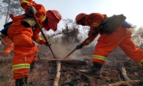 A forest fire broke out on Monday afternoon in Southwest China’s Yunnan Province, killing 19, including 18 firefighters. About 500 firefighters have been battling the blaze, local authorities said Tuesday. Most of the forest fires were caused by human activity, they said. Photo: cnsphoto