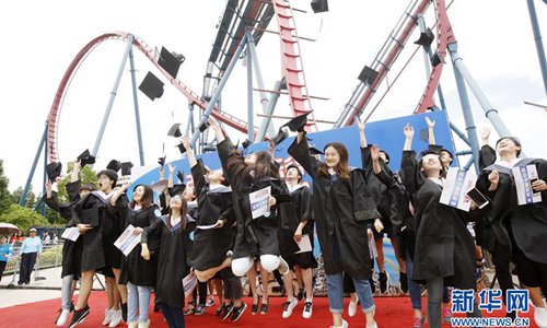 College graduates take a group photo to celebrate their graduation at the Happy Valley Amusement Park in Shanghai on June 11, 2017. Photo: Xinhua