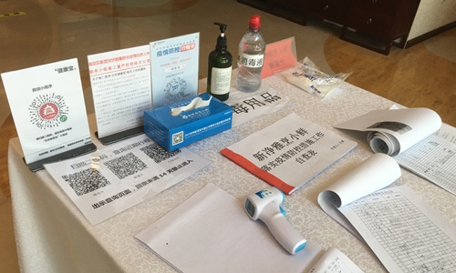 Sterilizers, a customer check-in book and an employee body temperature record book are seen on a table at New Jingya Cook Superb Cuisines restaurant in Beijing on Sunday Photo: Wang Bozun/GT