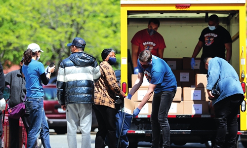 An NGO provides free meals in a residential area in New York City on Thursday. The first-time filings for employment insurance hit 3.2 million last week, the Labor Department reported Thursday. Photo: China News Service