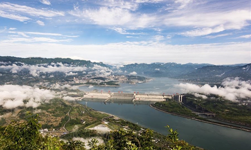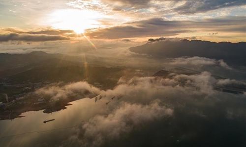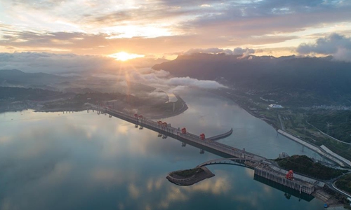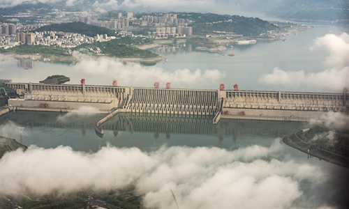 Aerial photo taken on May 10, 2020 shows a view of the Three Gorges Dam in early morning after a rain in central China's Hubei Province. (Photo by Wang Gang/Xinhua)