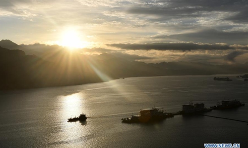 Aerial photo taken on May 10, 2020 shows a vessel sailing on the Zigui section of the Three Gorges Reservoir region in early morning in central China's Hubei Province. (Photo by Wang Huifu/Xinhua)