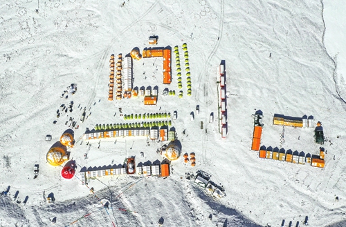 An aerial view of the Mount Qomolangma Base Camp at an altitude of 5,200 meters
