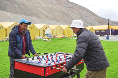 Mountaineers play foosball at the Mount Qomolangma Base Camp on May 1 Photo: Xinhua