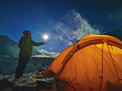 A man stands under a "super moon" on Thursday in the Mount Qomolangma Base Camp 6,500 meters above the sea level. Photo: Xinhua
