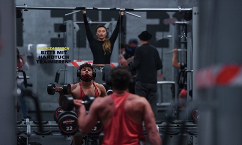 A gym member lifts weights as he exercises at the McFIT Studio fitness centre in Cologne, western Germany, on Monday. All 62 McFIT Studios in North Rhine-Westphalia reopened their doors at midnight for all members and was one of the first fitness centres to reopen in Germany due to the spread of COVID-19. Photo: AFP