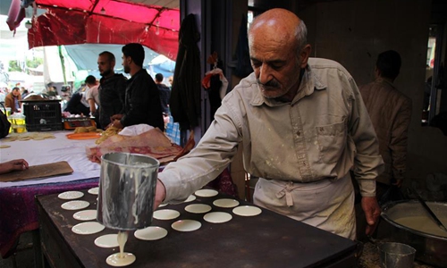 A Palestinian vendor makes traditional sweets known as "Qatayef" at a market during the holy month of Ramadan in Gaza City, on May 11, 2020. (Photo by Rizek Abdeljawad/Xinhua)
