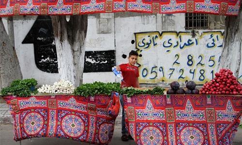 A Palestinian boy sells vegetables at a market during the holy month of Ramadan in Gaza City, on May 11, 2020. (Photo by Rizek Abdeljawad/Xinhua)