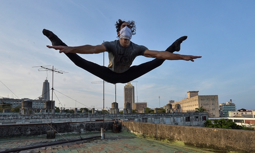 Cuban dancer Adrian Sanchez trains on the rooftop of his house in Havana on April 21. Photo: AFP
