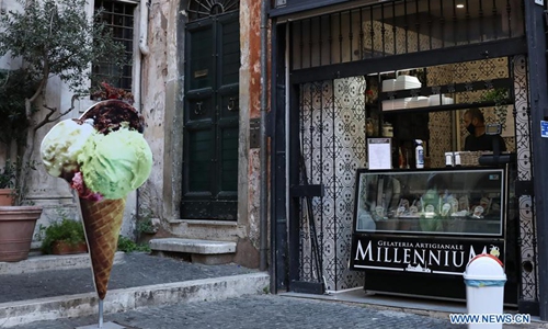A man waits for customers at an ice cream shop in Rome, Italy, May 12, 2020. (Xinhua/Cheng Tingting)