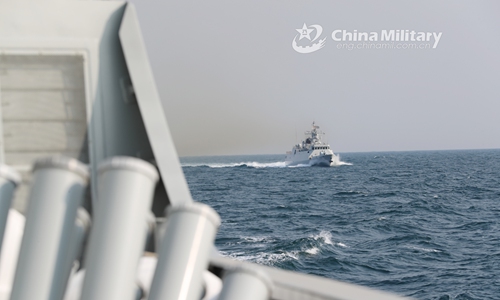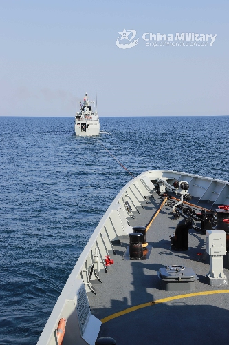 The guide missile frigates Xinyang (Hull 501) and Huangshi (Hull 502) attached to a destroyer flotilla with the navy under the PLA Northern Theater Command transit in formation during a recent round-the-clock maritime exercise in waters of the Yellow Sea. (eng.chinamil.com.cn/Photo by Wang Guangjie)