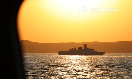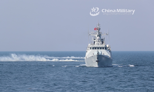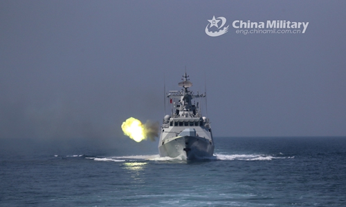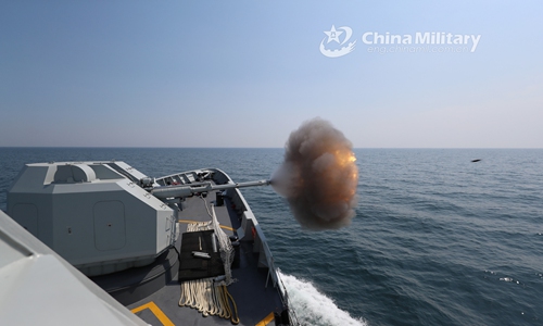 The guided-missile frigate Huangshi (Hull 502) attached to a destroyer flotilla with the navy under the PLA Northern Theater Command fires its main gun at mock sea targets during a recent round-the-clock maritime exercise in waters of the Yellow Sea. (eng.chinamil.com.cn/Photo by Wang Guangjie)