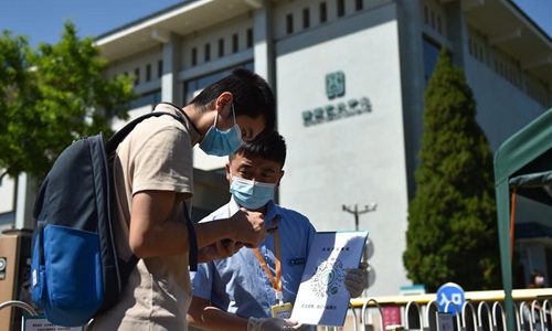 A staff member helps a visitor scan a QR code to present personal health code at the National Library of China in Beijing, capital of China, May 12, 2020. The southern area of the National Library of China reopened to the public on Tuesday. Visitors need to make reservations via the social media application Wechat or phone calls, according to a notice from the library. (Xinhua/Chen Zhonghao)