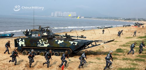 Marines assigned to a brigade of the PLA Navy Marine Corps move forward for assault after disembarking from their amphibious armored vehicle during a beach raid training exercise in the west of south China's Guangdong Province on August 17, 2019. (Photo: eng.chinamil.com.cn)