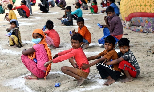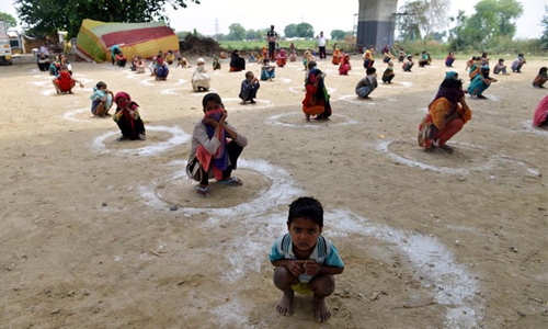 Kids sit in painted circles to maintain social distancing while waiting for their free lunch offered by a voluntary organization amid coronavirus crisis in East Delhi, India on May 11, 2020. (Photo by Partha Sarkar/Xinhua)