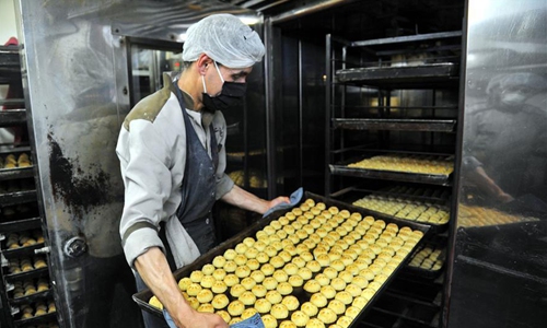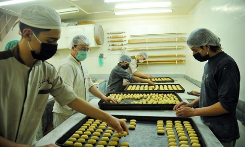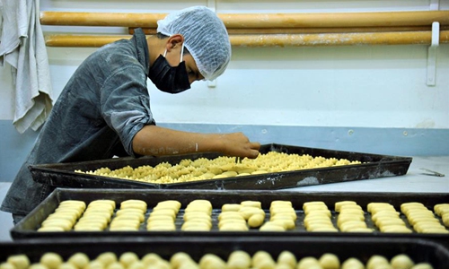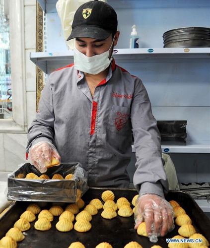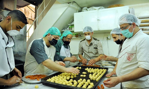 Sweet makers wearing face masks make special sweets called Ma'amoul for the holy month of Ramadan in Damascus, Syria, on May 13, 2020. A new COVID-19 infection was recorded in Syria on Wednesday, bringing the total number in the country to 48, the health ministry said in a statement. (Photo by Ammar Safarjalani/Xinhua)