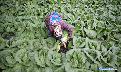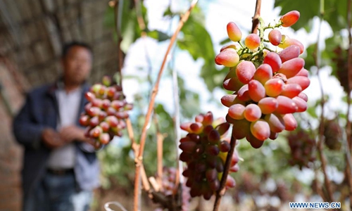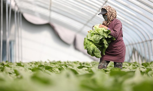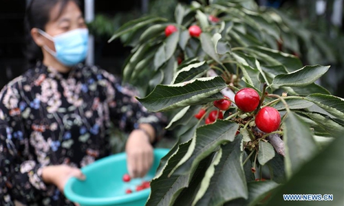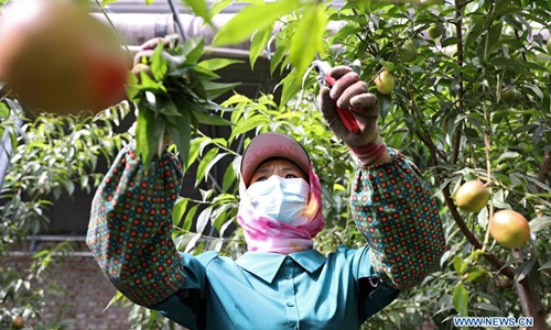 A farmer works in a greenhouse in Tai'an County, northeast China's Liaoning Province, May 12, 2020. Tai'an has been encouraging farmers to grow fruits and vegetables in greenhouses as a way to increase incomes. (Xinhua/Yao Jianfeng)