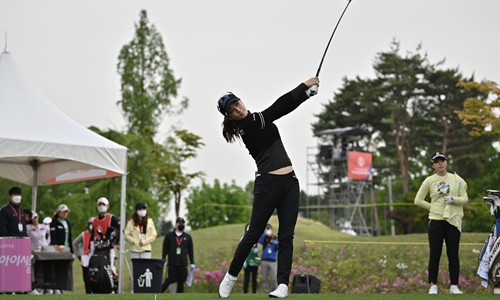 South Korean golfer Park Gyeol tees off in the 10th hole during the first round of the 42nd KLPGA Championship in Yangju, northeast of Seoul on Thursday. Photo: AFP